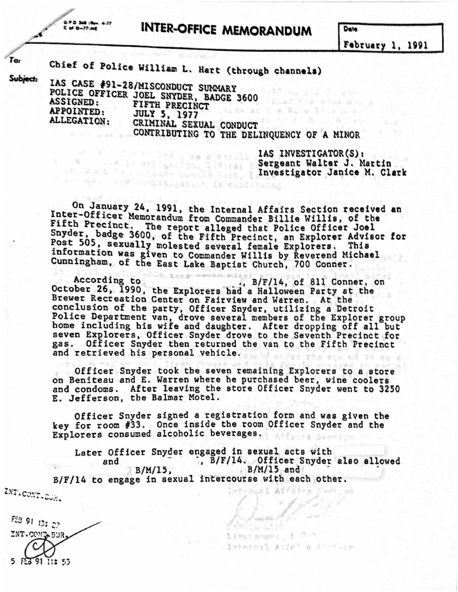 - Memo to Board of Police Commissioners and Chief Hart from Investigators, Subject: Suspension Without Pay of Police Officer Joel Snyder, Coleman Young Papers, Box 308-1, Burton Historical Library