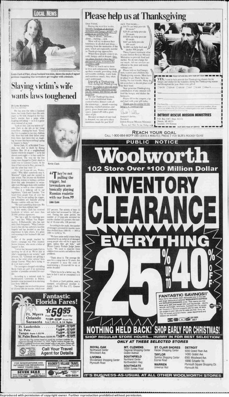 "Slaying victim's wife wants laws toughened," Detroit Free Press, November 11, 1993, General edition