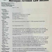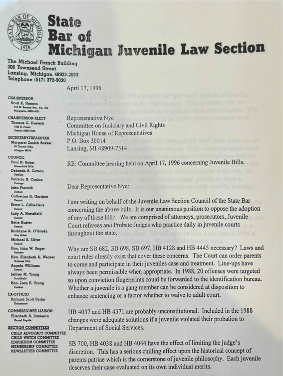 - State Bar of Michigan Juvenile Law Section Letter to Rep. Nye on 1996 Juvenile Justice Reform